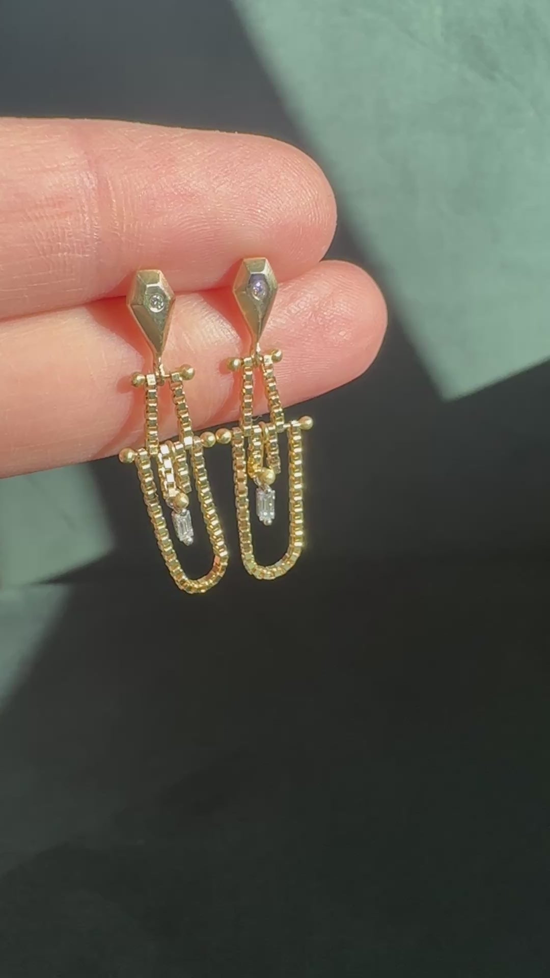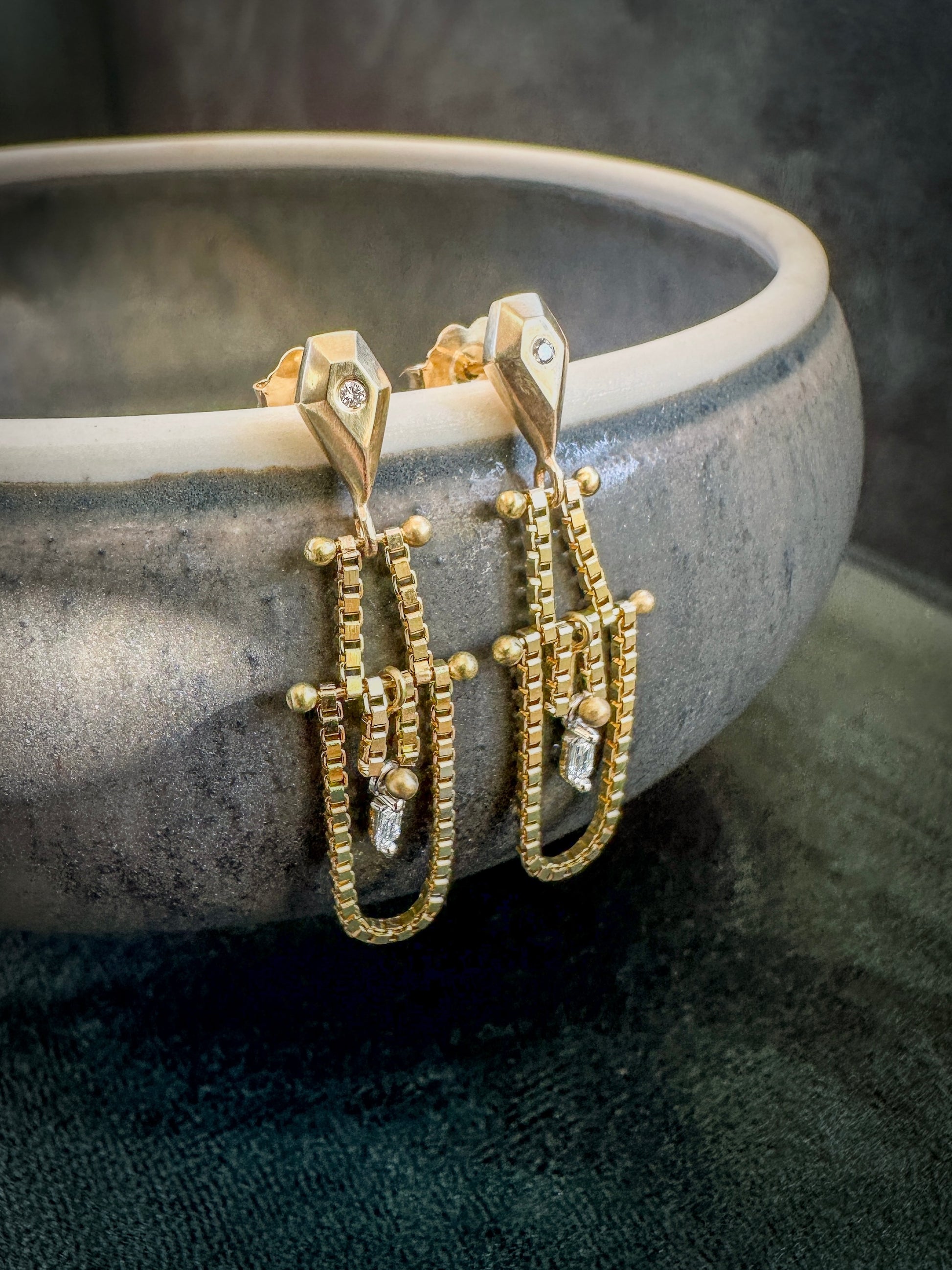 Playful movement and modern elegance, these earrings are perfect for holidays or everyday glam. Golden hand-sculpted geometry accented with diamonds for texture and light, these earrings are both striking and sophisticated.